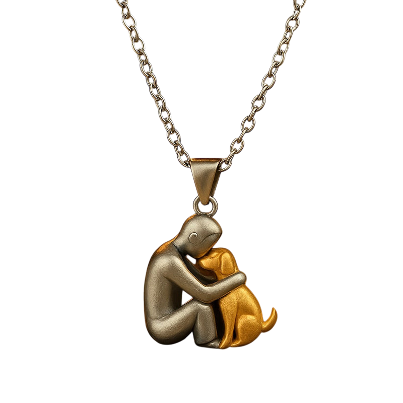 Tämä liikuttava kaulakoru esittää naista, joka hellästi halaa koiraansa — koru, joka symboloi ehdotonta rakkautta, uskollisuutta ja erityistä sidettä ihmisen ja lemmikin välillä.